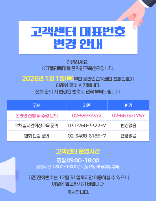 2026.01.01(목)부터 온라인교육센터 전화번호가 변경됩니다.